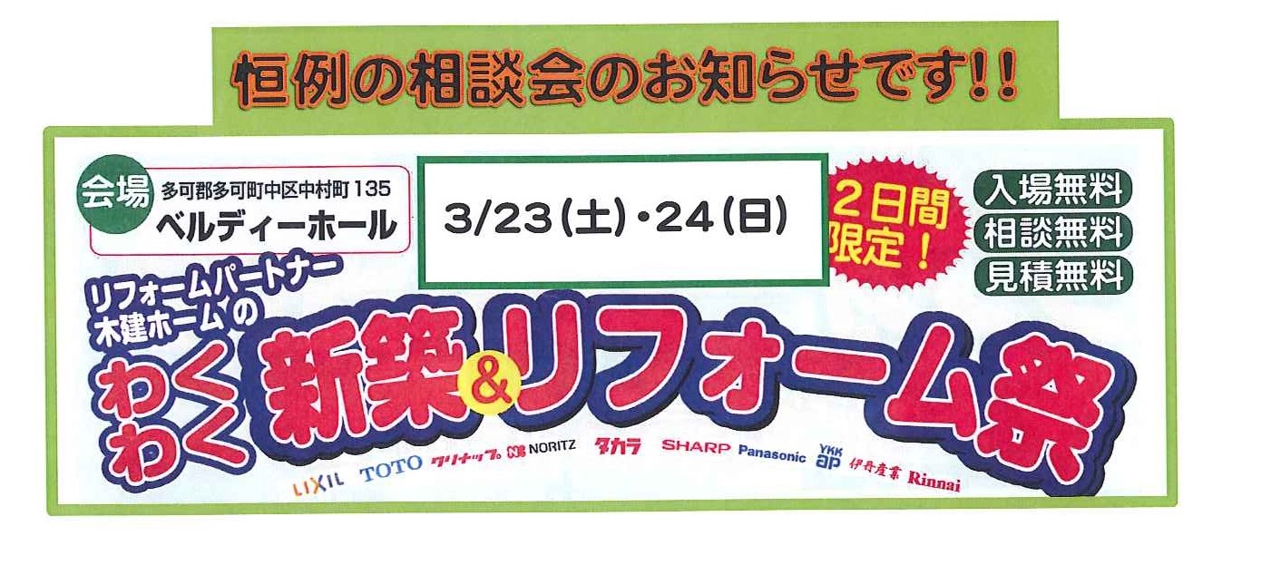 3/23~24 ベルディーホールで展示会 月別アーカイブ 2025年6月 2025年1月 2024年9月 2024年2月 2023年10月 2023年5月 2023年4月 2022年6月 2021年4月 2019年9月 2019年8月 2019年3月 2019年1月 2018年9月 2018年1月 2016年8月 2019.03.20 地域密着だから、小さな修繕工事からリフォーム・増改築・建替まで承ります。 いろんなメーカーの水廻り商品を展示しておりますので、見て触って確かめて下さい! そして、今年も皆様に感謝!感謝!感謝!の気持ちを込めて、わくわく特典をパワーアップしました。 皆様のご来場をお待ちしております。 « 前へ一覧へ 次へ »